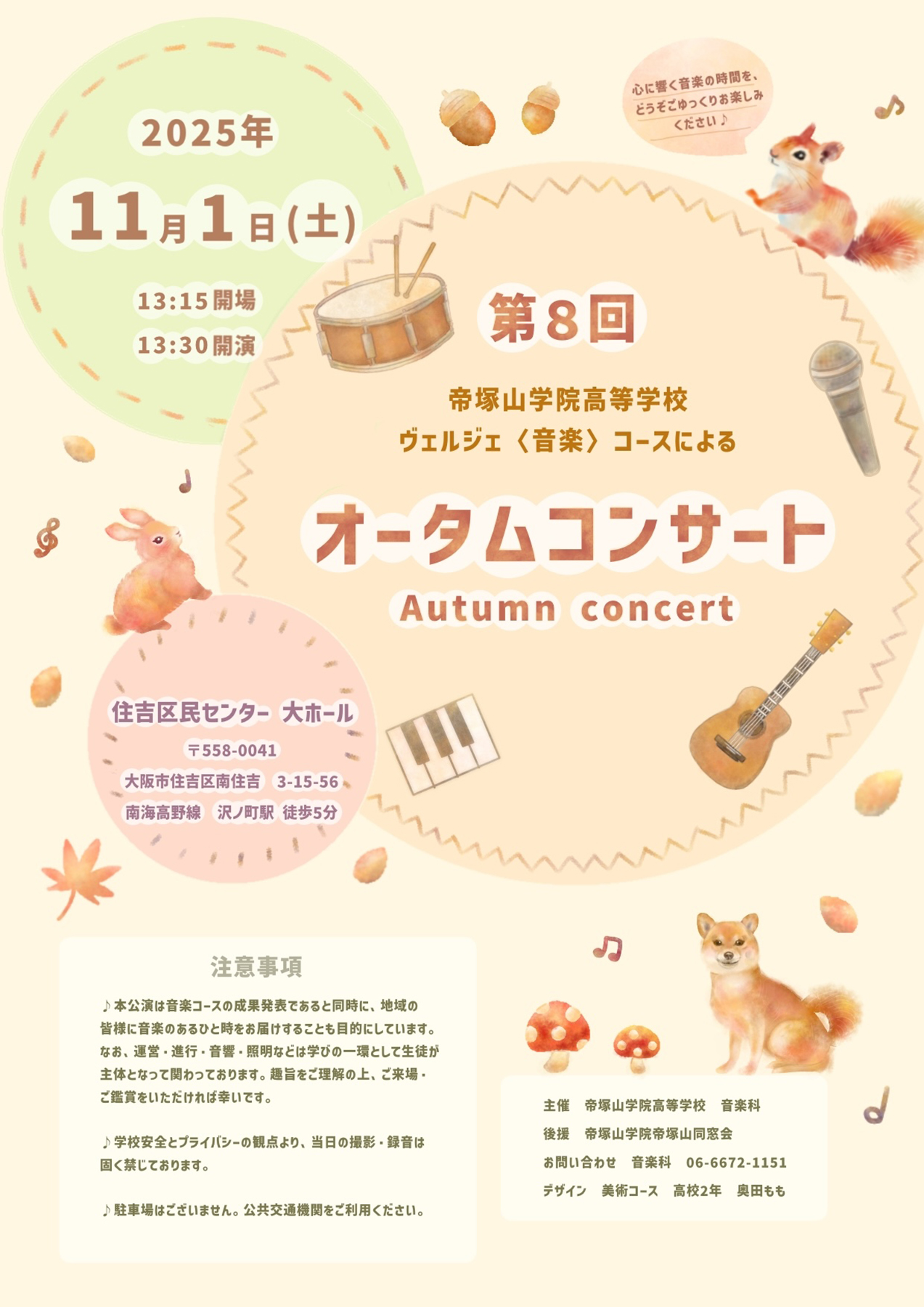 今年で8回目を迎えます「オータムコンサート」は高等学校音楽コース生の日頃の成果発表の場であるとともに、コンサートの企画・準備・運営・演出において生徒達が主体的に動き協働作業を経験するという、授業だけでは得られない学びの機会としての役割も持ちます。 オーディションを経て選抜されたソロ・アンサンブルならびに全員による合唱をどうぞご鑑賞ください。 〈入場無料〉