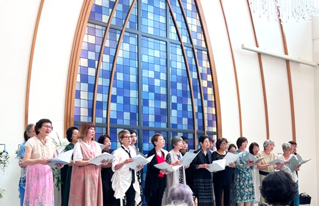 大阪からも同窓会連絡協議会の山田代表はじめ、辻野大学同窓会長、秋田短期大学同窓会長また田中泉ヶ丘同窓会長のほか多く参加を頂き、賑やかな同窓会となりました。今回もMADAM e DOの総勢22名の皆様による【今日は朝から雨】【いのちの歌】の2曲の歌の後、学院歌と祝歌を全員で斉唱し、清々しい気持ちになりました。この様に関東在住の同窓生が集まり、お話しもはずみ楽しいお昼の時間を過ごしました。みなさまより開催会場にもお褒めのお言葉も頂き安堵しております。